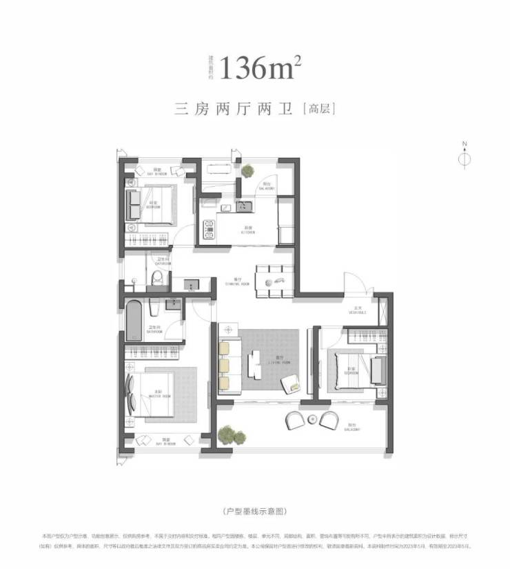 建面约136㎡,三房两厅两卫[高层]