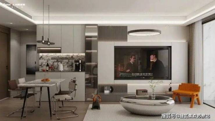 客餐厅贯通一体,视野通透,让整个空间都明亮有加,搭配一张1.4米的大理石餐桌,石材不仅美观,还赋予了空间一种惬意和静谧的感觉。餐边柜中空做轨道插座,可以放早餐机和咖啡机,满足家用小电器的使用。木饰面用深灰色,搭配软装,提升氛围感,结合灯具,呈现出温馨家的感觉。