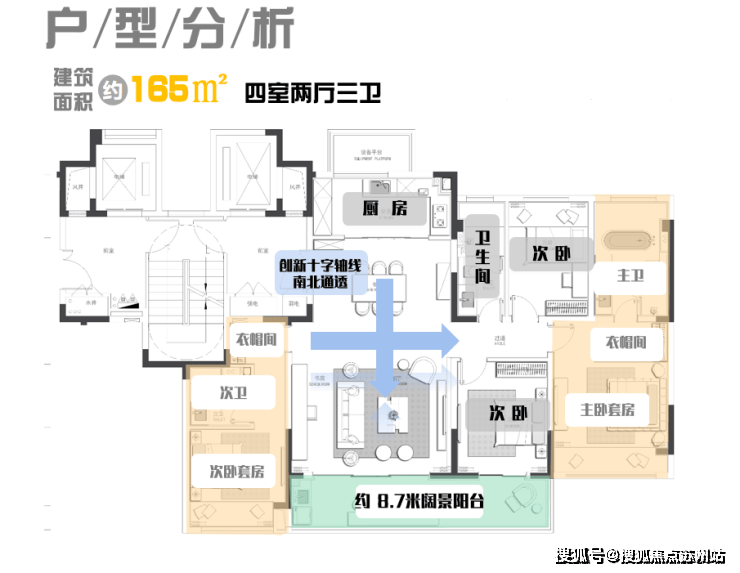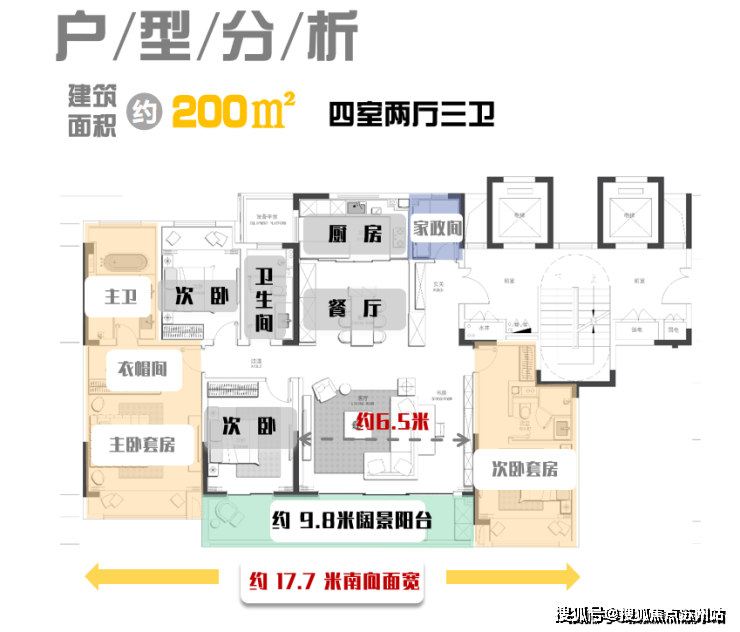 南向面宽可达约16.1米,四开间一体朝南敞开,1厅3卧直面阳光,采光性和通透度都非常优越。