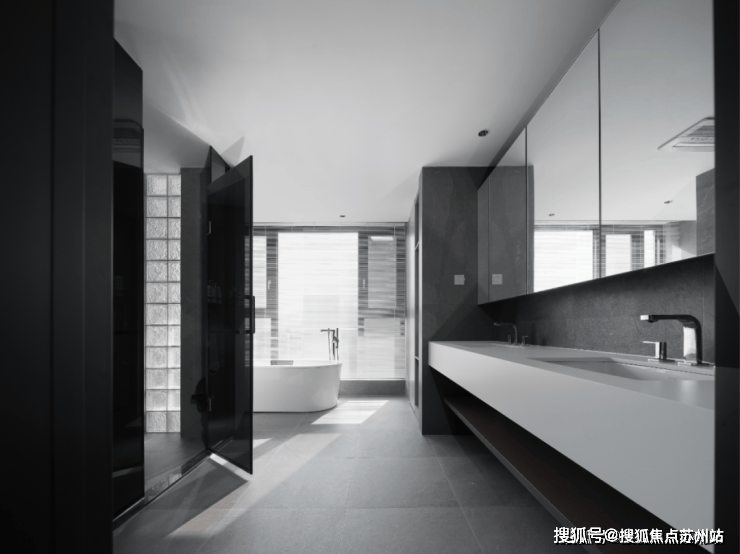 然后我们将色差与丰富的质感层次展示在空间的表现力之中。光滑的石材、玻璃表面,与黑色框体、柜门融合,在餐厨、卫浴空间,创造与整体形成强烈反差的视觉感受。将现代简洁、注重功能性的家居体验,通过精心布局和选材方式,清晰地呈现在主人面前。