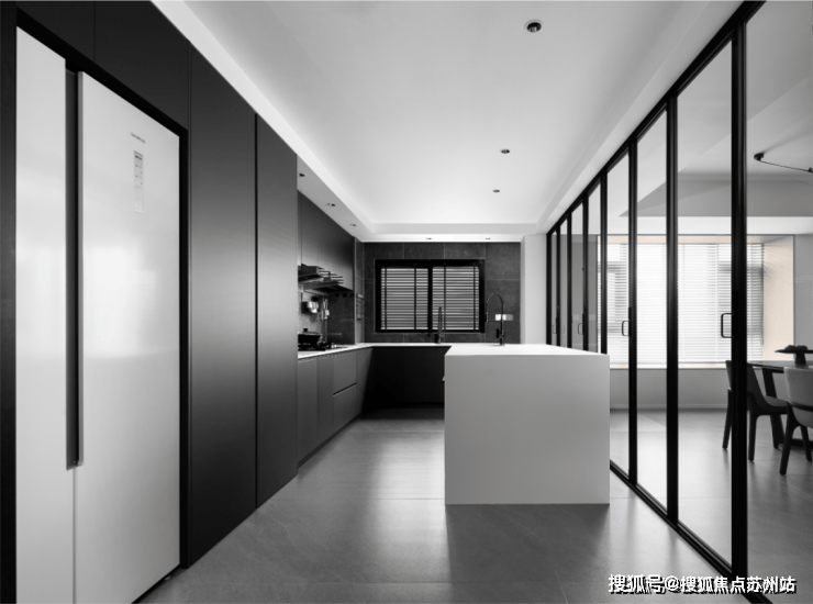 项目特意打造了半开放式的厨房。在做中餐时可以紧密闭合,避免油烟走出,这种厨房形式,不仅可以实现厨房、客厅、餐厅(BLDK)一体化