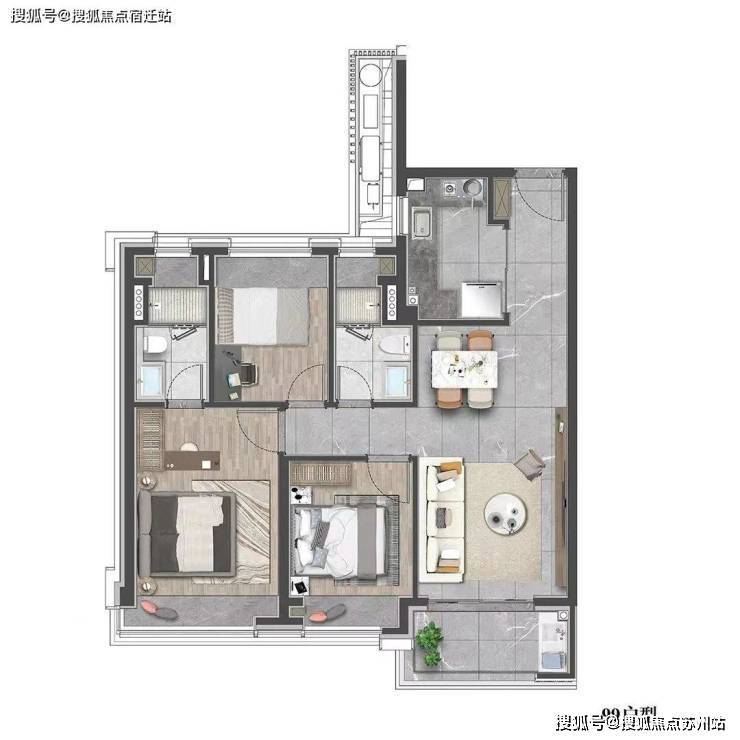 建面约99㎡的三房设计,在空间上使用功能更加多样化,一站式解决了家庭生活的所有功能,优化居家动线,大大提升空间的居住体验。三开间朝南,采光面相当充裕,户型正气且通透,南向景观阳台,更佳的观景视野;主卧套房,双卫设计,也让生活更方便、更显排面。