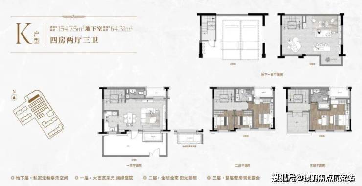 一楼和地下室主社交和志趣,二楼是子女的房间,三楼是主人休憩区.