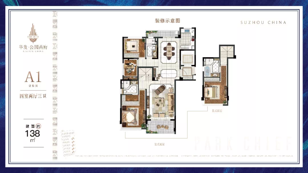 从品质到口碑,华发·公园首府自亮相以来,便收获了姑苏广大名贤雅贵的认可与青睐。高人气的背后,是华发股份对产品的精心规划,对客户生活习惯的深刻洞察,以匠心造诣,将品质与细节融入生活中。建面约138㎡A1四室两厅三卫的住宅,高端人居的奢适户型,咬合式的复式设计,上下南向双主卧双套房,超高窗地比,以空间尺度礼遇生活高度。