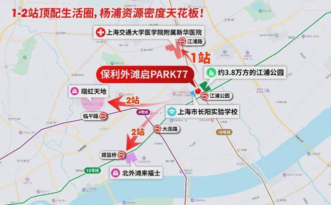更难得的是,1-2站范围内,三甲新华医院、北外滩来福士、瑞虹商圈、江浦公园、长阳实验学校等顶配资源一应俱全.