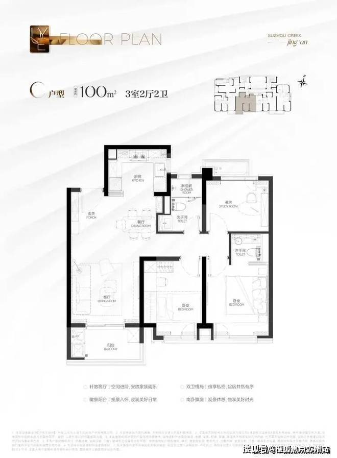 建筑面积约100㎡3房B&C户型:3房功能性符合市场主流需求,三开间朝南的布局保证充足光照。动静分离的设计让安静与活力同在。主卧套房设计,舒适度和私密性双爆表!悦97售楼处营销中心:400-8828-814悦97售楼处电话/地址☎:400-882-8814(开发商热线)