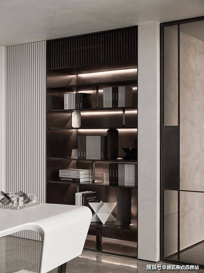 大片深棕色落地玻璃,使整体宛如生长在室内的建造物,结构强烈,与空间有机结合。