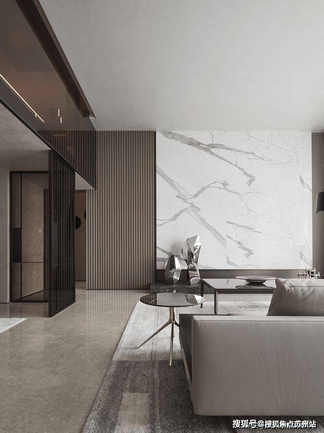 占据整体居所视觉中要的,是以鱼肚白大理石构成的客厅背景墙,线条明晰,行云流水,宛若破晓山涧,都市中突显的自然气息。