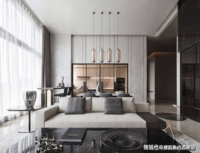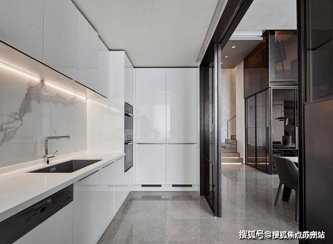 客厅后侧是厨房,格挡是采用深色玻璃制作而成的推拉门,内部整体为白色柜面,墙体呼应客厅背景墙,以爵士白大理石为装饰,优雅温厚,细节充盈。
