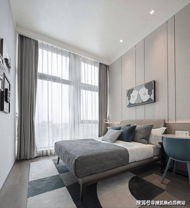 通过走道和客厅,客卧在房屋的另一端。墙面层叠的造型令人耳目一新,与主卧立面遥相应和,独立的卫生间与衣帽间为客卧的不同使用者提供了贴心的私人起居。