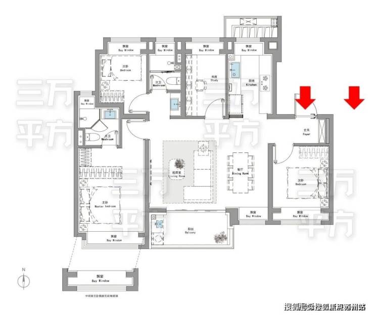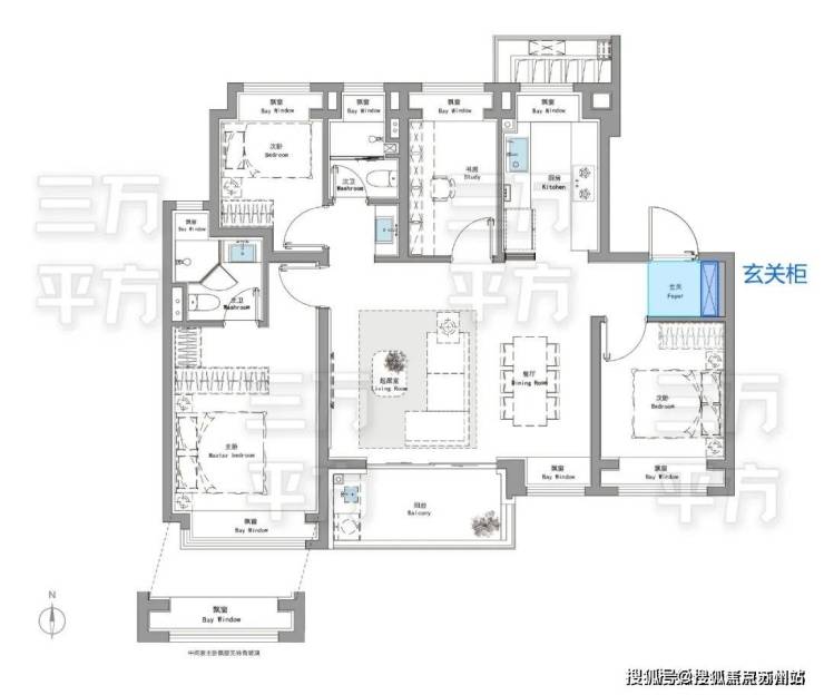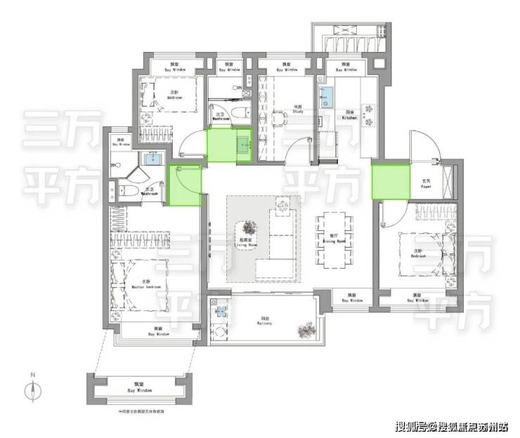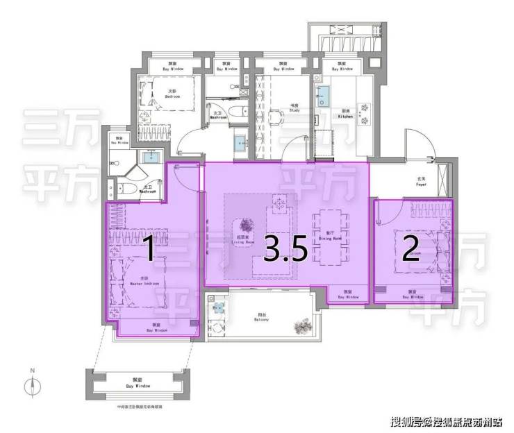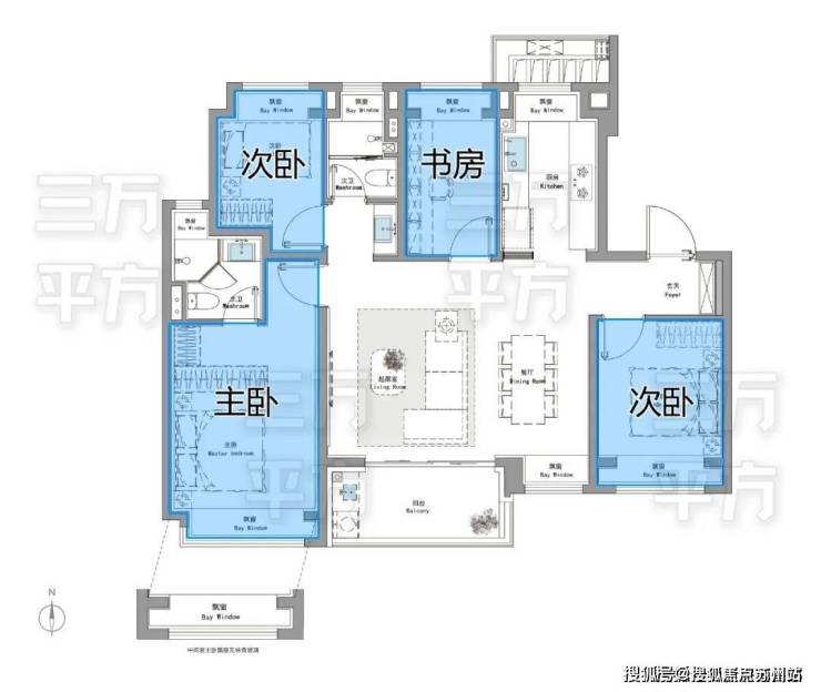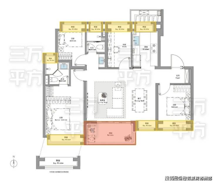 所有居室特意赠送飘窗,还能与家具布置结合,让功能大扩展。比如北书房可以改为舒适的儿童房,南向主次卧室可以把飘窗和化妆桌、书桌结合设计使用。兼顾每一位家庭成员居住的舒适感,让改善置业一步到位。