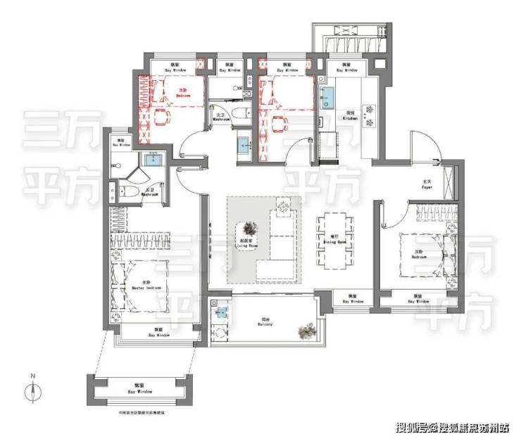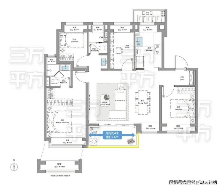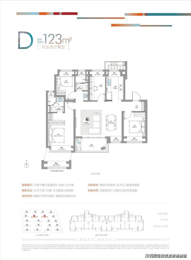【招商时代潮派售楼处电话:400-8123-664【预约热线】☎✅】建面123㎡D户型给每一个房间都加上了飘窗,两个卫生间、所有卧室、厨房、餐厅均带飘窗,实用率拉满,做出了建面140㎡+户型的既视感。