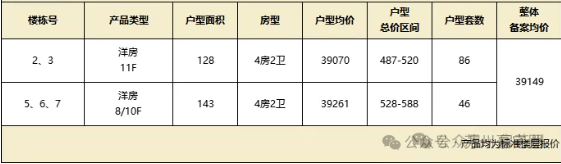 整体备案均价约39149元/㎡,单价约37442-40958元/㎡,总价约487-588万/套,精装交付。