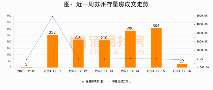 从存量房来看,2023年12月16日苏州存量房单日成交27套,比昨日减少277套,环比下降91.1%。从近一周存量房成交来看,苏州存量房日均成交套数为185套,12月16日单日成交27套,低于近一周平均水平85.4%。
