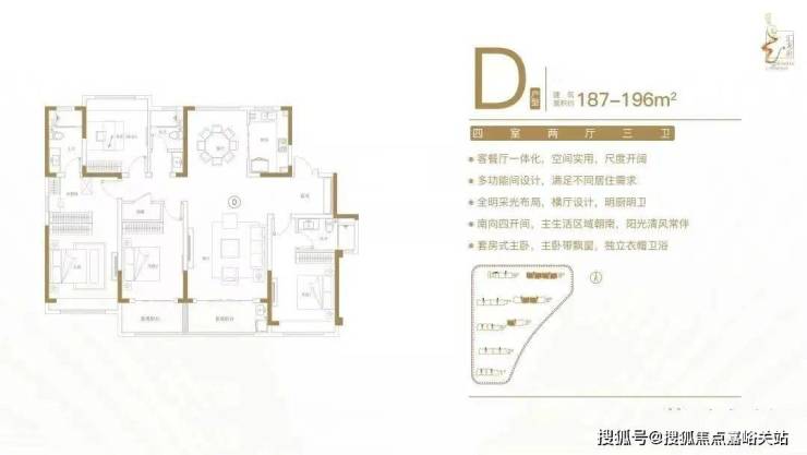 建面约187-196㎡四室两厅三卫户型特点:户型方正,南北通透,动静分区有序;双套房设计,卧室带飘窗,独立卫生间;客餐厅一体化,尺度开阔,全家共享;全明采光布局,告别暗房,明厨明卫;南向四开间,阳光清风常伴.