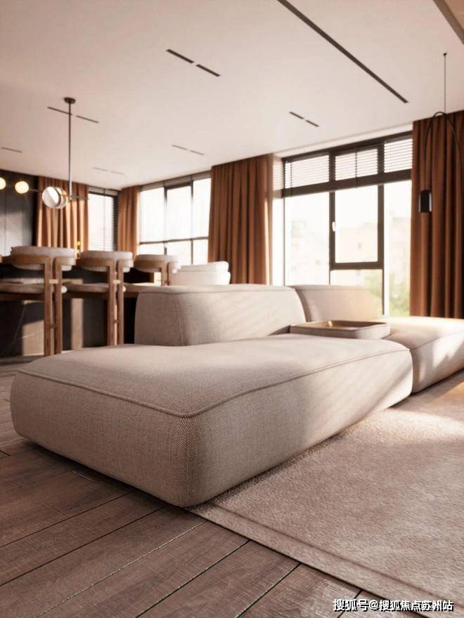 客厅的观感舒适而有格调,半面的自然光线引入空间,软包沙发烘托出沁人心脾的柔和氛围。一桌、一椅、一凳,都融合得恰到好处。