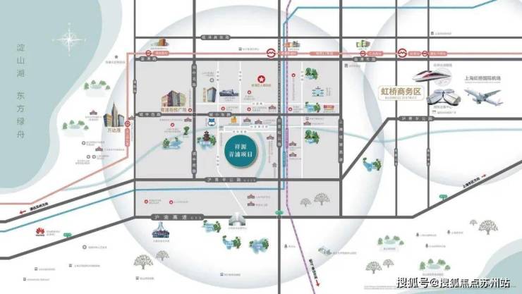 交通配套方面:项目周边有沪青平公路,外青松公路,沪渝高速和绕城高速环伺,自驾还是相对便捷;地铁17号线青浦新城站,距离项目约2.5km。
