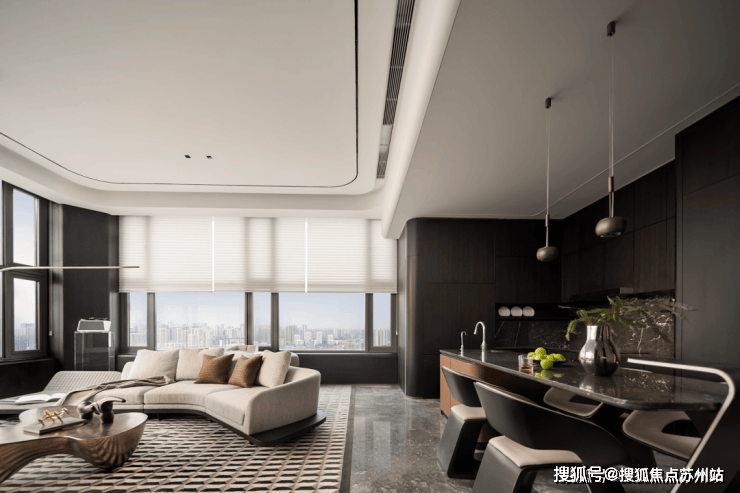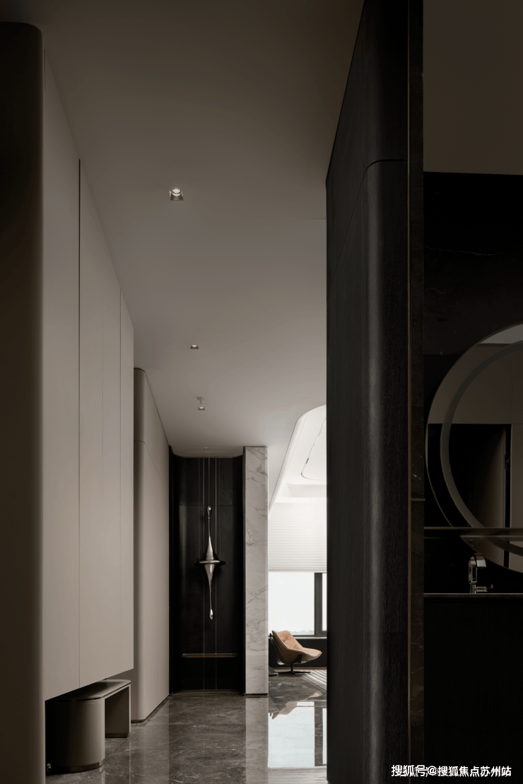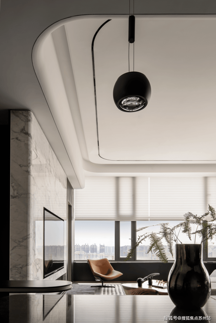 设计师精心选用的开放式布局,还有各式精美的家具,配以相搭的材质元素,不同材质的不同质感交合,在黑白灰主色调的背景映衬下,更能彰显出空间的丰盈和优越质感。