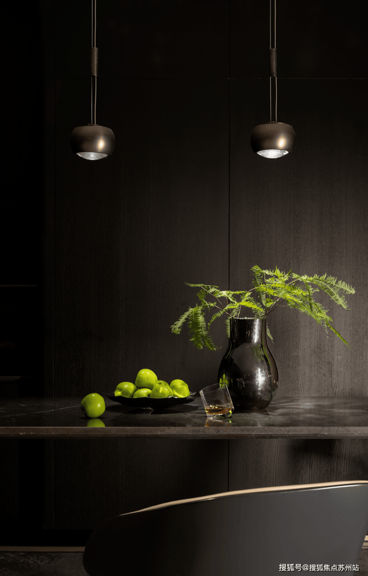 今天要带大家欣赏的,是一套开放式设计的公寓,主色调是黑白灰,气质满满,配以深色石材元素和金属元素,赋予空间更强的节奏感和干练感。