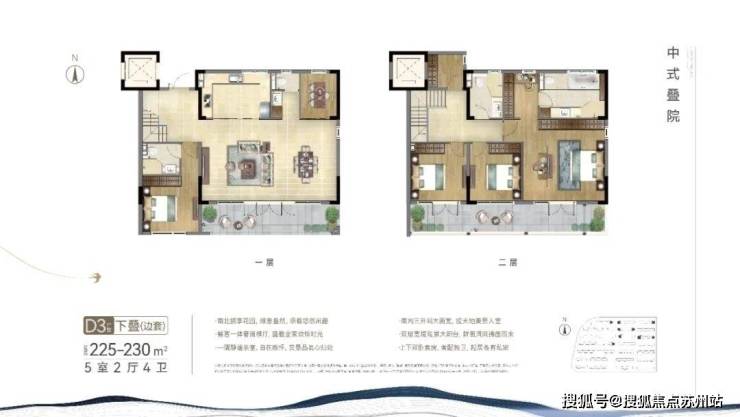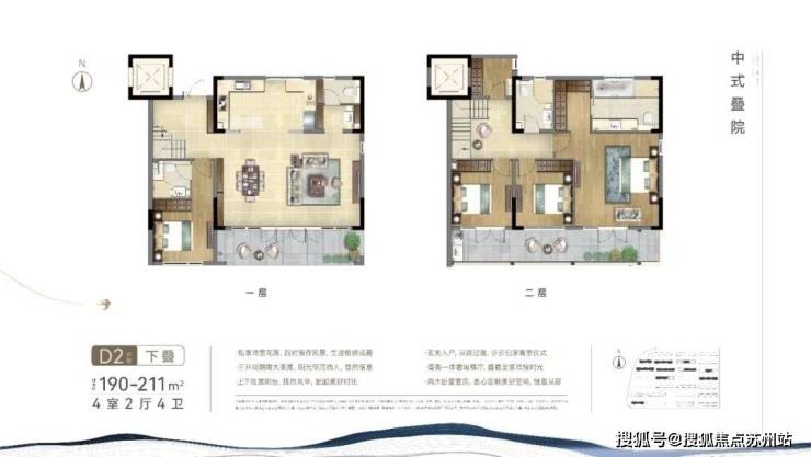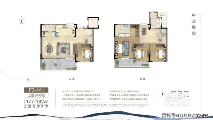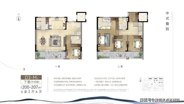 项目中叠户型方正, 三开间朝南,最大限度的采光,同时功能齐全,居住舒适。这个户型从街巷的北侧入户,与下叠的南侧入户形成分流,很好地 提高了私密性,大门入户是中式的门头,尽显中式韵味。