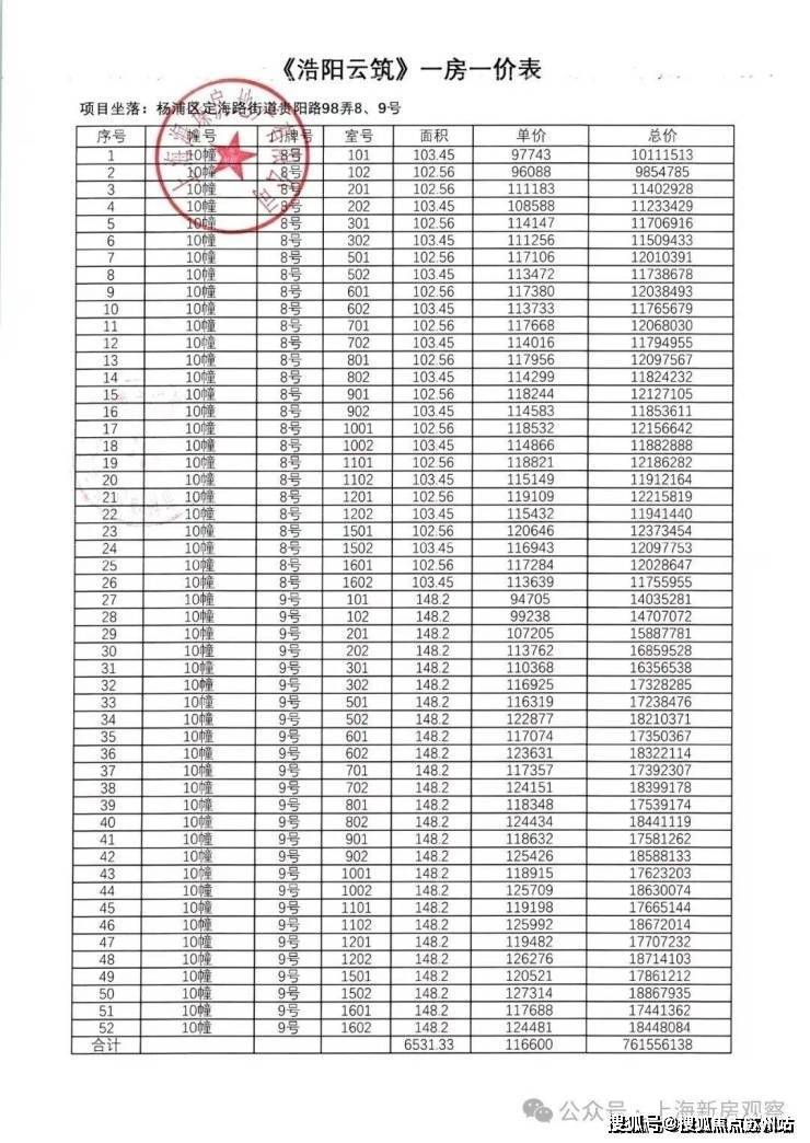 上期一房一价表如下: