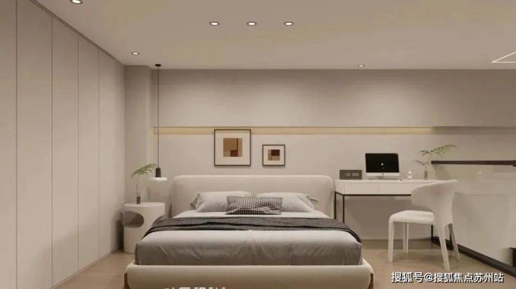 昆山中创商业中心售楼处电话☎:400-8123-664(预约看房热线)卧室的设计,沿用了整体色调与风格的一致性,通过软装细节的调试,显得整个空间多了一份宁静和放松。床头背后的长城板加硬包,以及墙面的线性灯设计和衣柜的破板设计,都展现出设计,对细节上的把握都非常的精细。