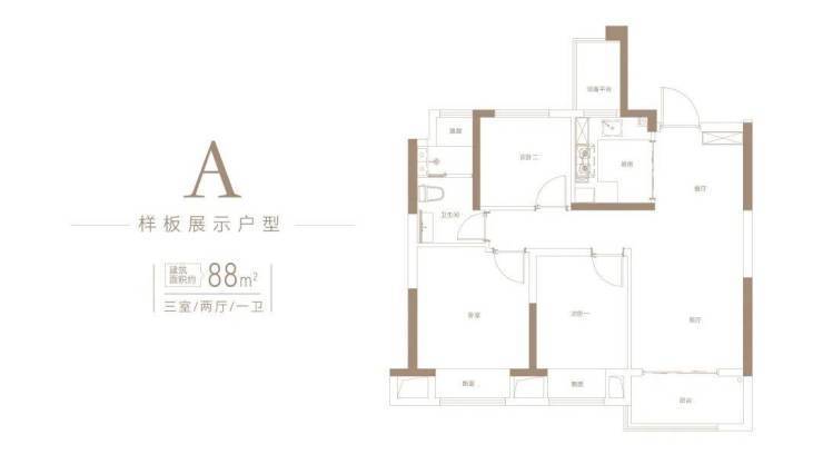 建面约88㎡:三室两厅一卫,全明双阳台设计