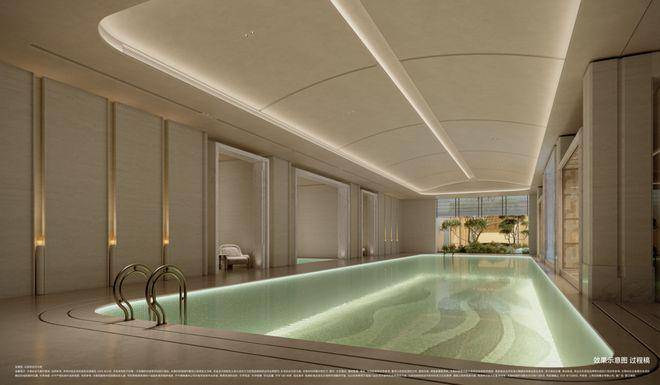 栖境泳池,曲线穹顶、奢石立面和下沉庭院景致相融,天光经采光井漫洒,云影徘徊。
