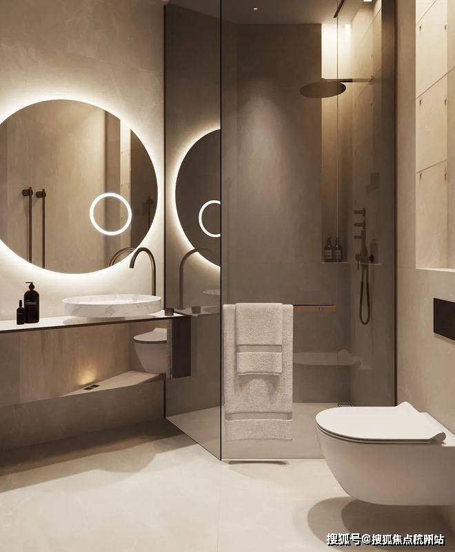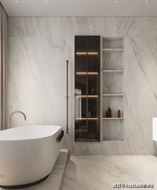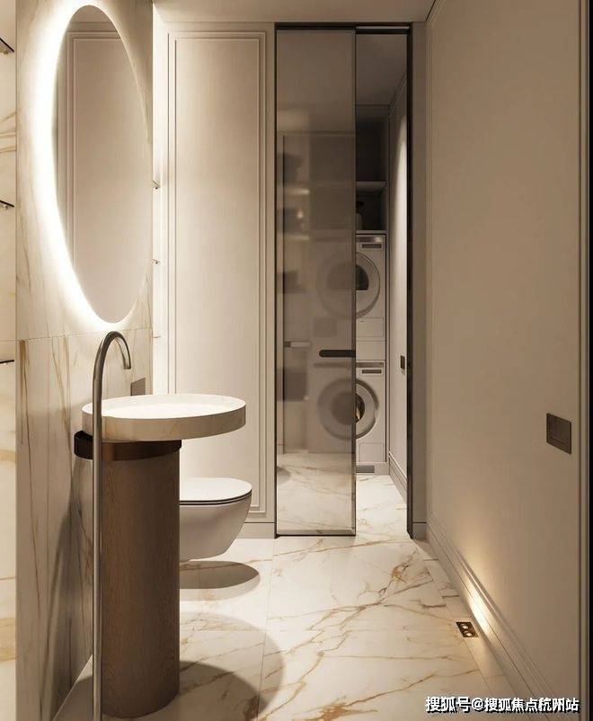 Thebathroomexpressesthecleanlinessofthespacethroughbrightlight,andthewhitemarblesetsoffthecleannessandpurityofthespace,showingasenseofhighquality.