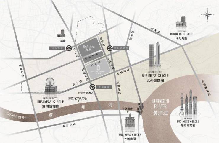 商业方面:3公里范围内,汇聚苏河湾万象天地、北外滩商圈、瑞虹商圈、南京西路商圈、外滩商圈、陆家嘴商圈等,东南侧步行可达18街坊,西南侧在建安康苑、湾上综合体地块。