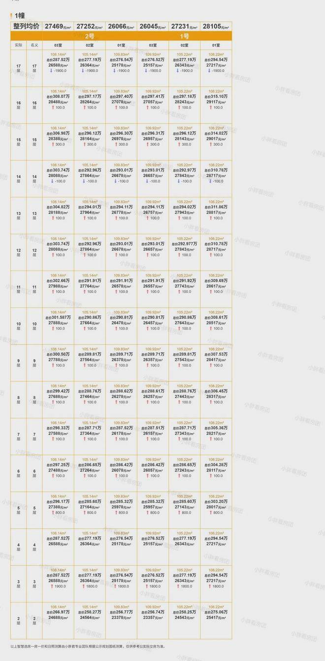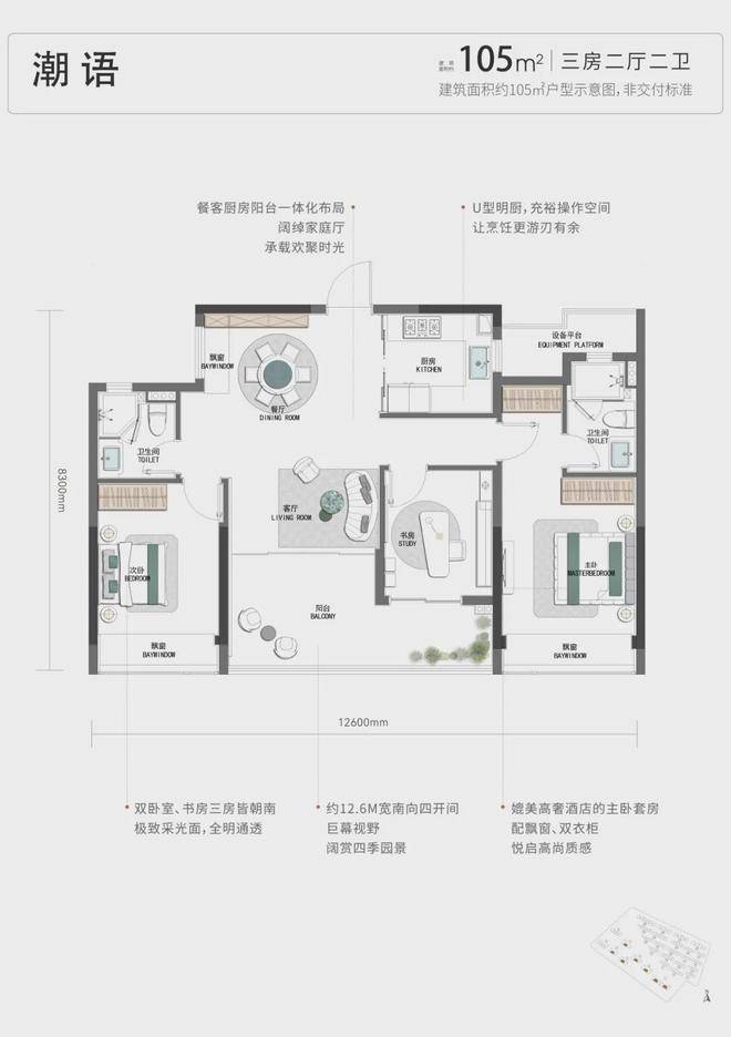 项目的户型起步就是四开间朝南的建面约105方三房: