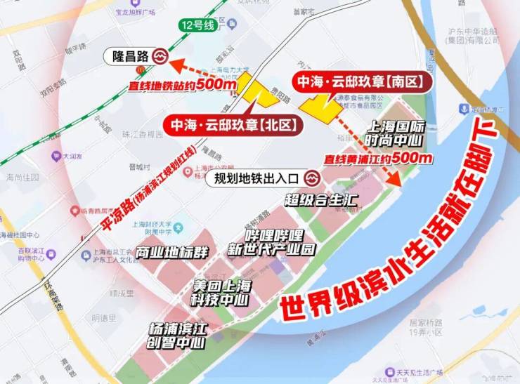 在售新房中距离江岸最近项目,直线仅约500米!一路之隔就是超极合生汇、美团、b站,真正杨浦滨江核心商务区,世界级滨水生活就在脚下!