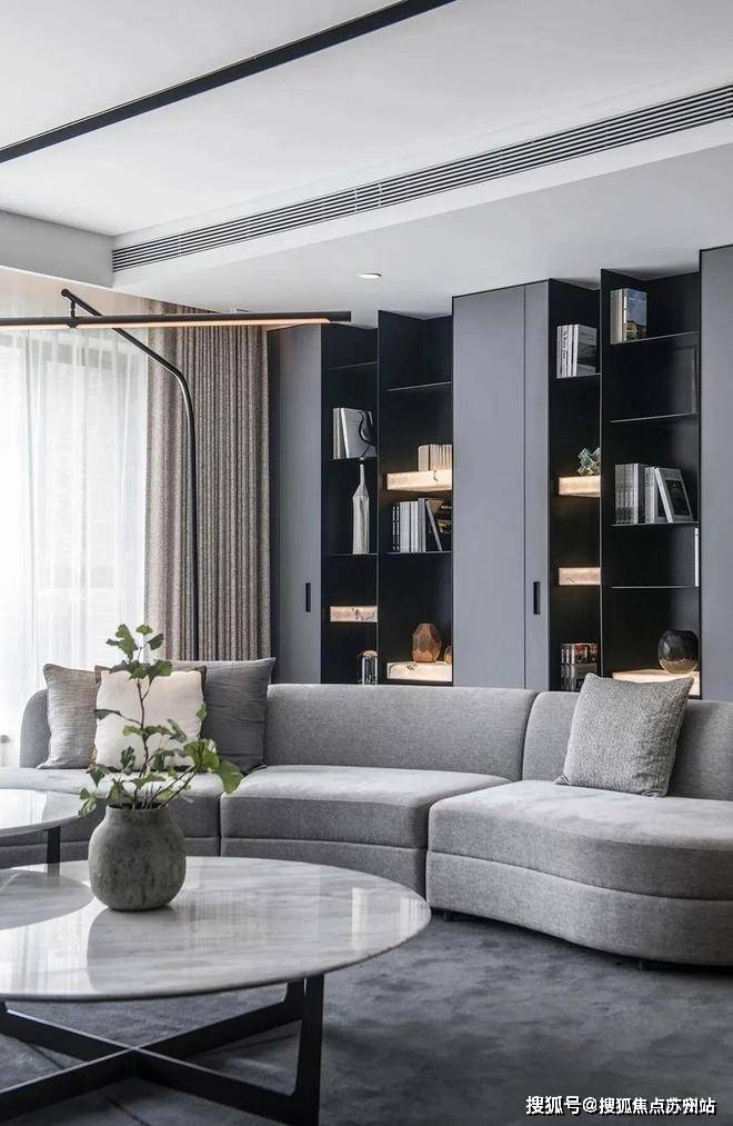 客厅大面积的书墙除了造型层面之外,更加赋予空间产生在人文方面的强烈气息。
