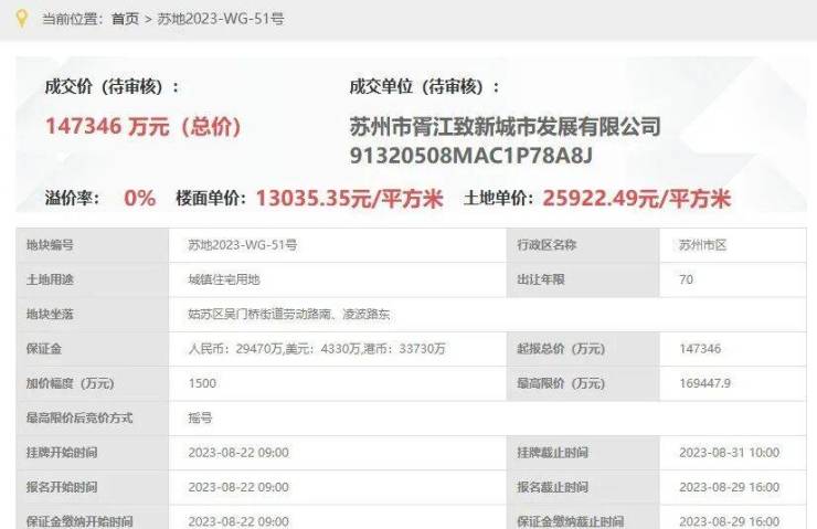 该项目于2023年8月31日由苏州市胥江致新城市发展有限公司以底价14.73亿元竞得,成交楼面价13035元/平。