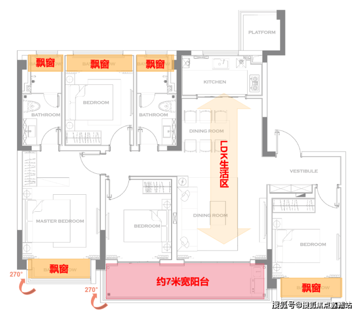 该户型以入户大玄关 售楼处电话: 400-9696-224+大四房+ 售楼处电话: 400-9696-224多飘窗+270°转角阳台的设计,4开间朝南面宽13.6,客厅+次卧双阳台设计开间7米,主卧开间3.5米,右次卧开间3.1米。