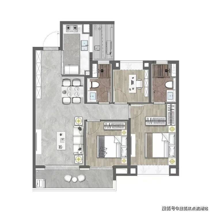 建面约99㎡3室2厅2卫户型,主要位于1、2号楼,1梯2户设计,做到了三开间朝南+双阳台设计+动静分离+主卧套房设计,功能性和尺度感完美结合.