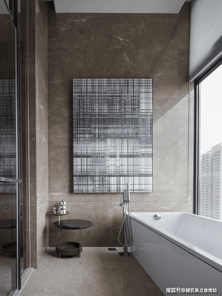 衣帽间在深色玻璃后方,浴室位于另一侧,靠近阳台的区域设有浴缸,灰褐色大理石与客厅空间相得益彰。