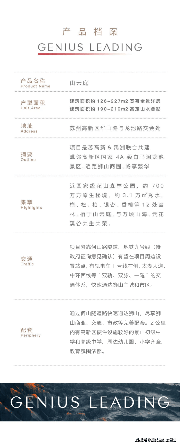 苏州,只有一个狮山,不曾有,也不再有,它和人民路一样见证了板块的发展和变迁。如今,新区狮山已成苏州高端商业圈,拥有丰富资源,三条地铁经过,房价也和园区一样位列苏州前茅。在一席必争的狮山西,山云庭建筑面积约126-227㎡新品洋房,即将加推!此刻狮山,再无其他,恭迎品鉴!