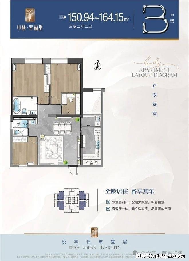 B户型164㎡——3房户型(双套房设计➕老龄/儿童房)全龄聚居各享其乐+独立洗衣房