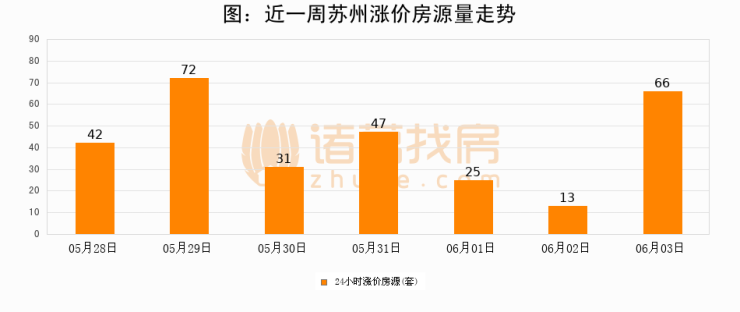 根据诸葛找房数据显示,苏州24小时涨价房源量为66套,较06月02日增加53套,环比上涨407.7%。与此同时,涨价房源占比小幅扩大,业主信心有所提升。
