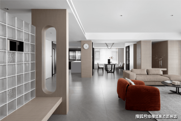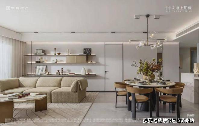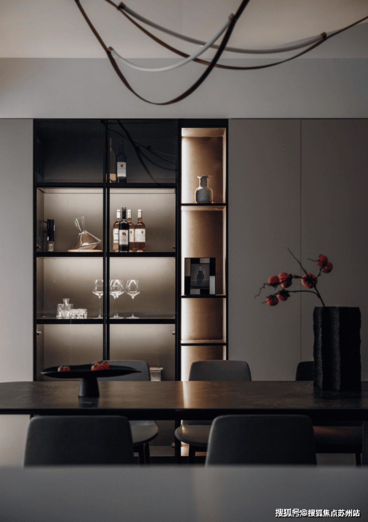 近50㎡的超大客餐厅,可以轻松容纳下岛台、中式大圆桌、沙发、电器墙等生活场景,承载阅读思考、美食分享、聚会休闲、音乐趣味等多种生活功能。