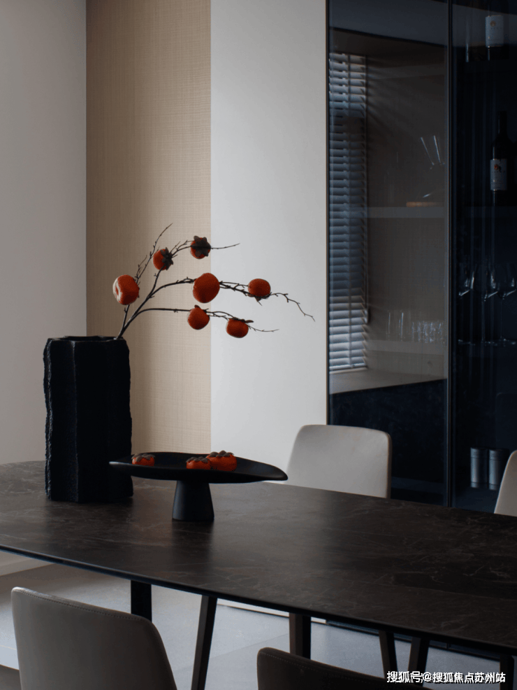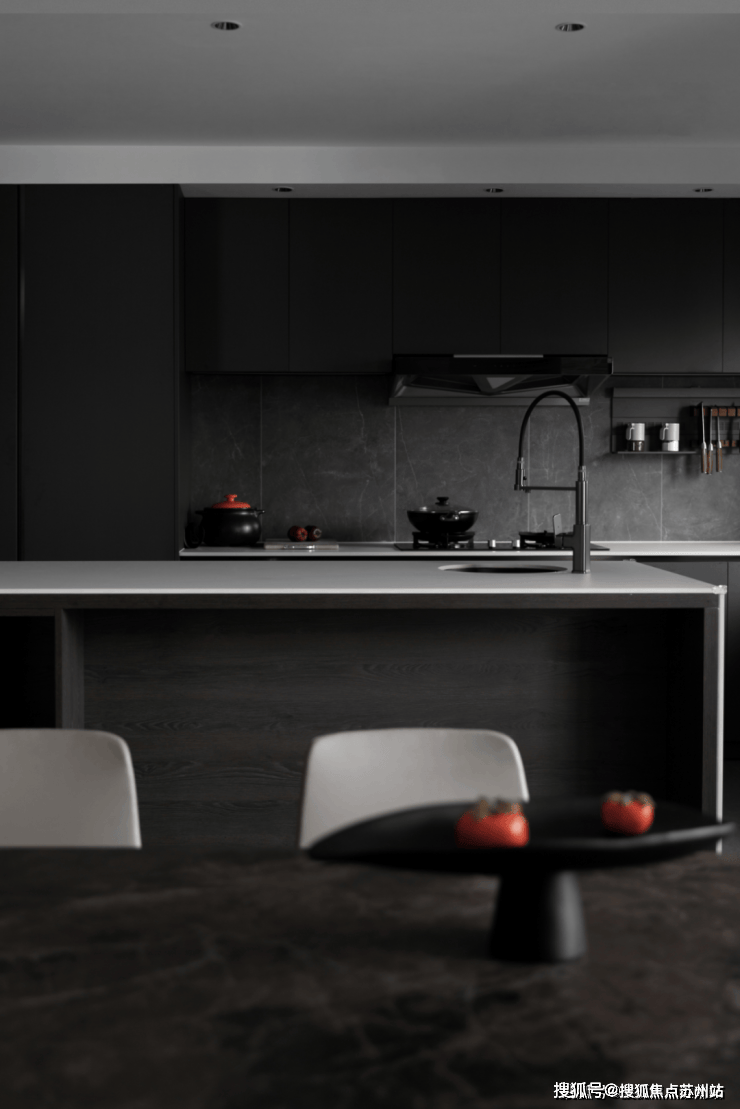 然后我们将色差与丰富的质感层次展示在空间的表现力之中。光滑的石材、玻璃表面,与黑色框体、柜门融合,在餐厨、卫浴空间,创造与整体形成强烈反差的视觉感受。将现代简洁、注重功能性的家居体验,通过精心布局和选材方式,清晰地呈现在主人面前。