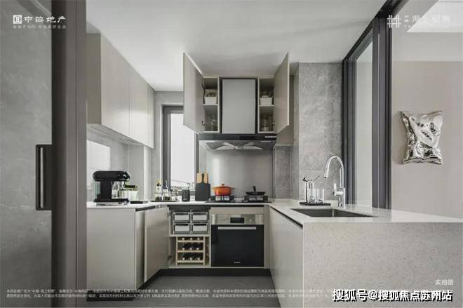 项目特意打造了半开放式的厨房。在做中餐时可以紧密闭合,避免油烟走出,这种厨房形式,不仅可以实现厨房、客厅、餐厅(BLDK)一体化