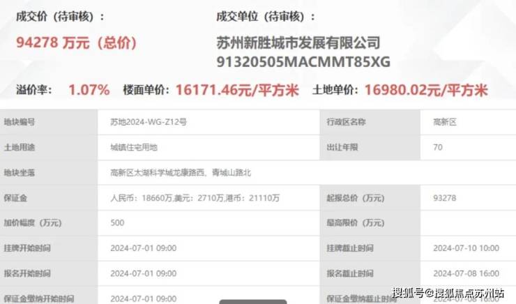 该地块(苏地2024-WG-Z12号)是苏高新(苏州新胜城市发展有限公司)于2024年7月10日,以总价94278万元竞得,成交楼面价16171元/平,溢价率仅1.07%(也是托底)。
