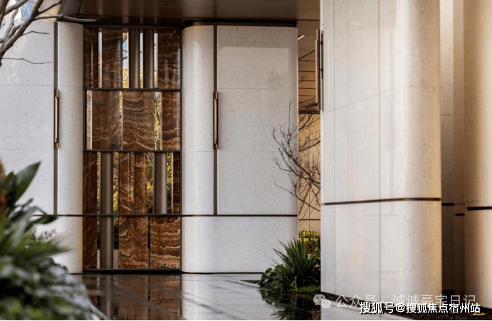 门庭延街的外立面,以精工定制弧形米色石材为主调,镶嵌典藏级老虎玉大理石,点缀古铜色现代海派艺术感灯器,整体呈现出百年海派的贵雅气质.