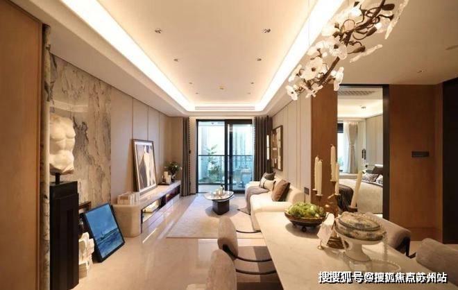 来到建面约112㎡3房2厅2卫样板房,设计主打海派风格,开放式厨房和西餐岛台,卫生间地面拼花,石材台面镀金龙头。标准的三开间户型,设计上将传统的过道改为餐厅空间,将公共区域做大了。
