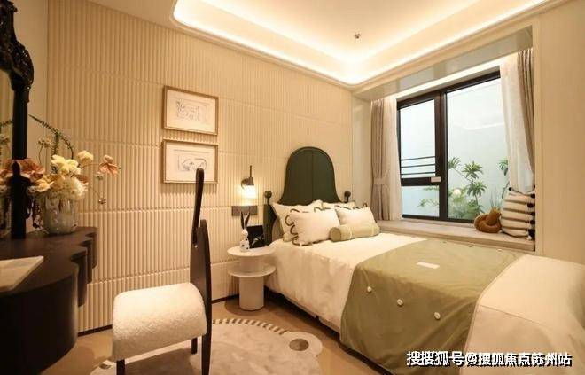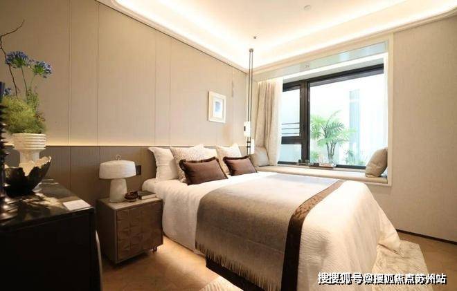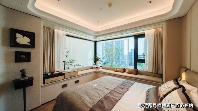 再来看看134㎡3室2厅2卫样板房。比起112㎡户型,这个客厅要宽敞很多,岛台也可以做成独立样式,摆放6人长桌也绰绰有余。主卧采用270度拐角飘窗设计,采光面拉满。