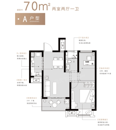 ① 建面约70㎡,两室两厅一卫。刚需置业的 好选,空间利用十分高效,性价比高。餐客厅一体化、南向观景飘窗卧室、270°观景阳台,都让空间显得更加开阔明亮;干湿分离卫生间、L型厨房,区域功能划分明确。