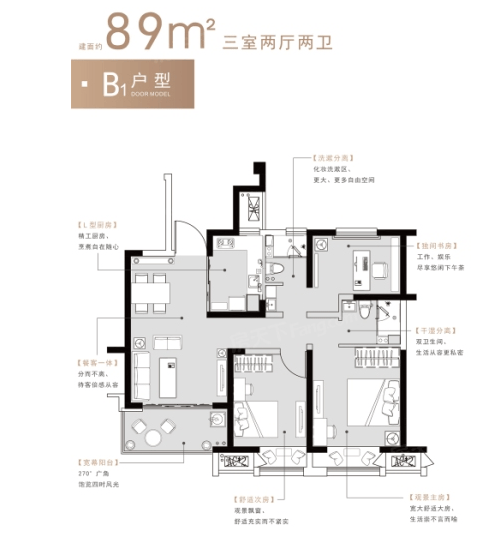 ② 建面约88㎡,三室两厅两卫。市面少见的家庭成长型户型,主卧、次卧、客厅的空间分配合理,宽敞舒适,厨卫功能也十分全能。
