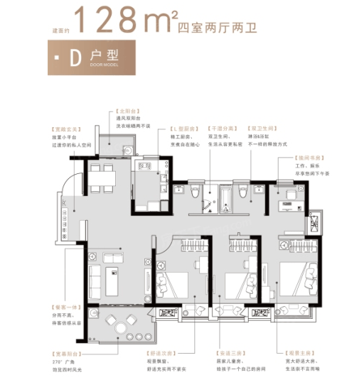 ④ 建面约128㎡,四室两厅两卫。更多的房间,满足更多的家庭成员生活需求。户型四面朝南采光,让整个房子全明通透;超大尺度客厅是家庭聚会的好地方,套房式主卧,尊崇性与私密性兼得。